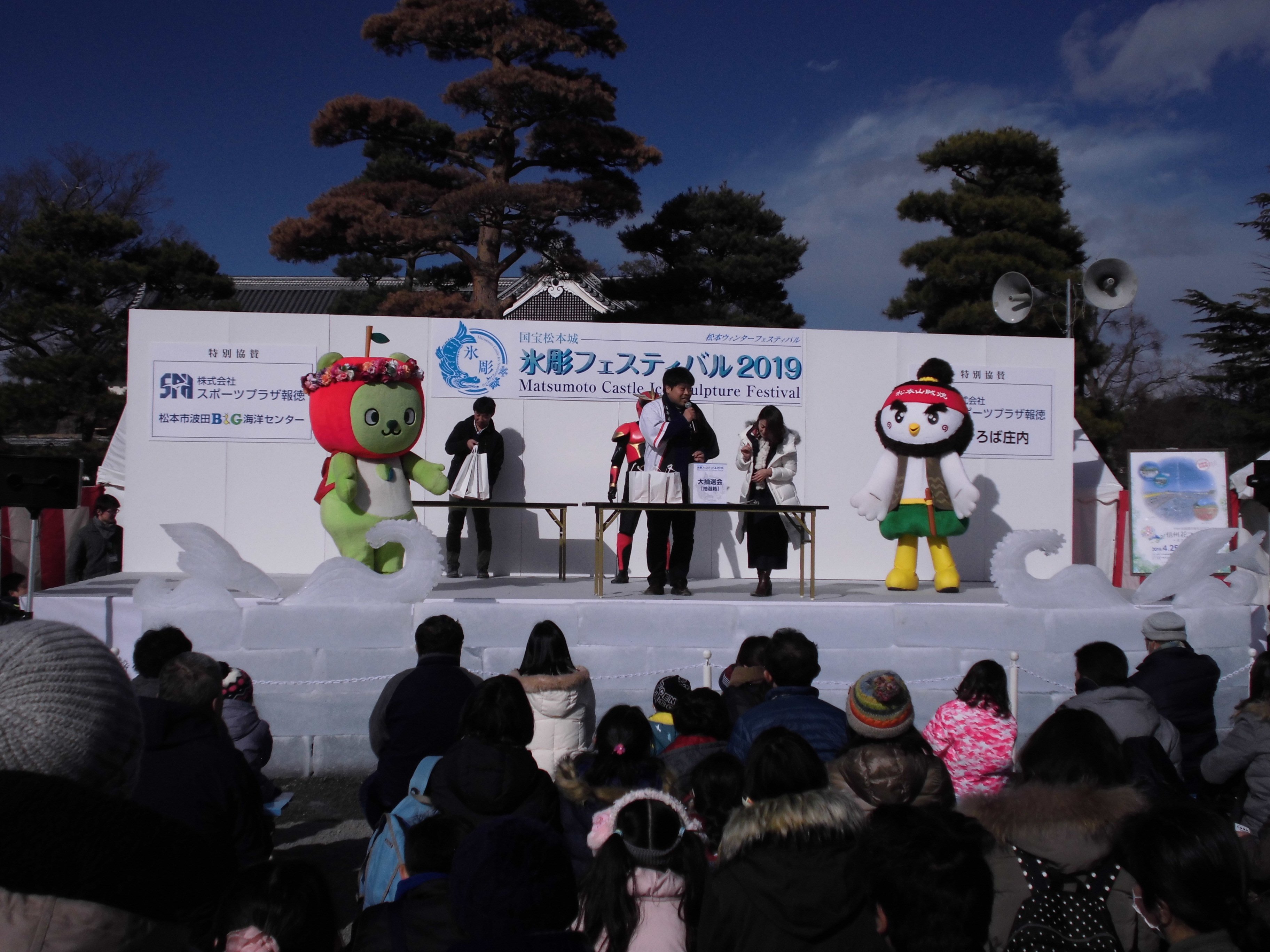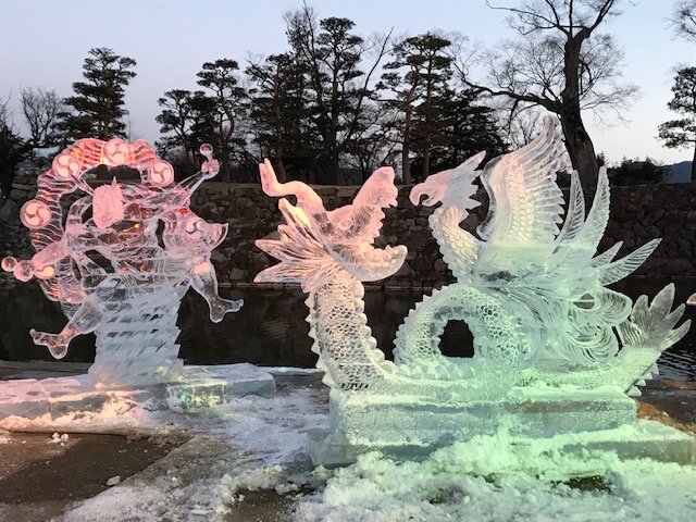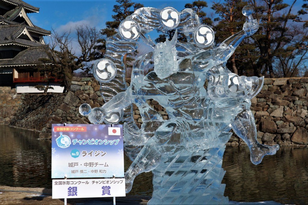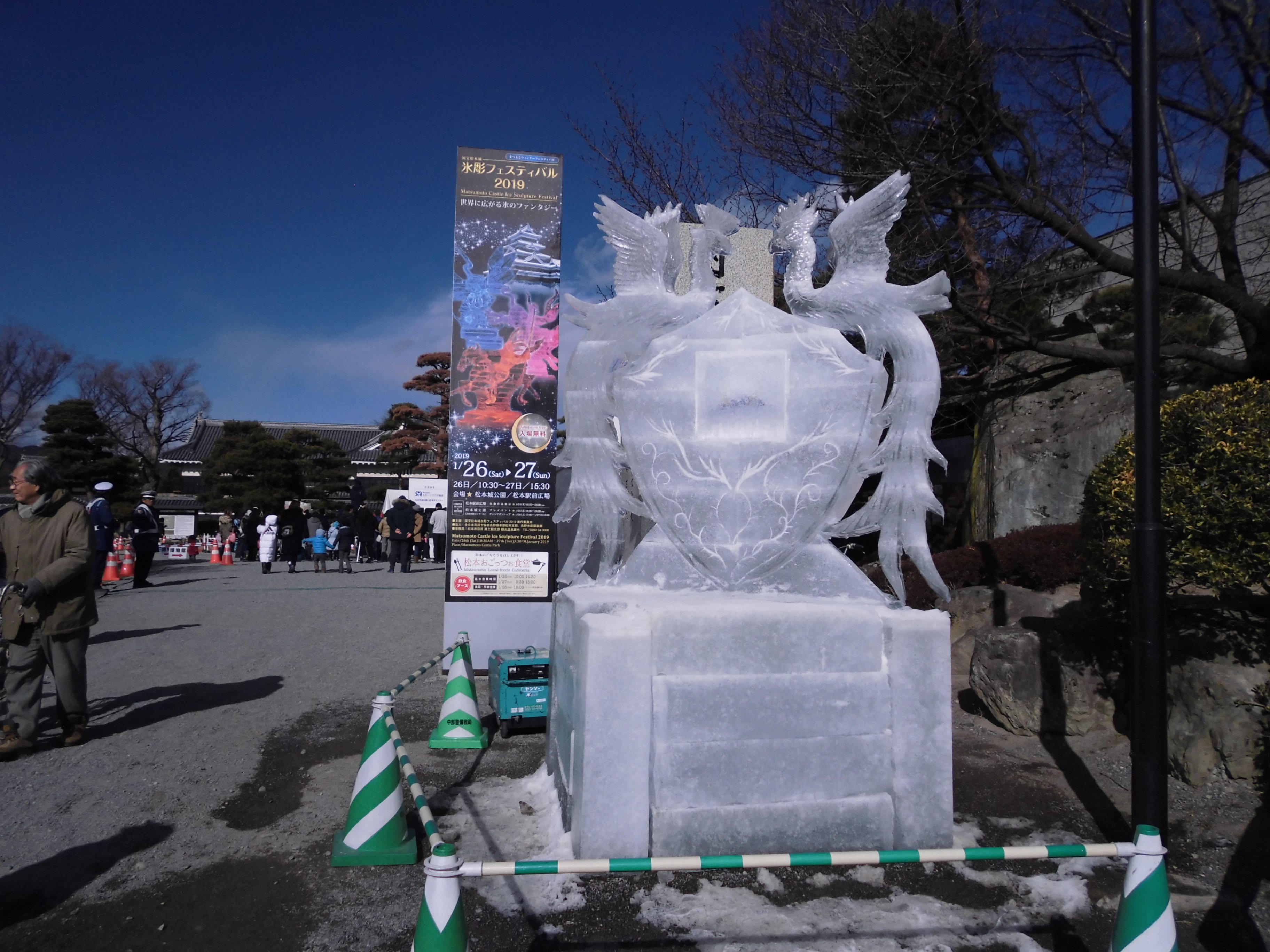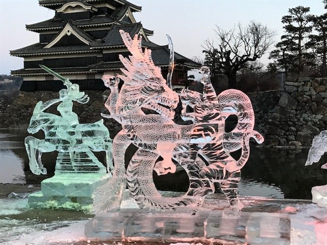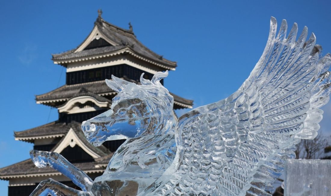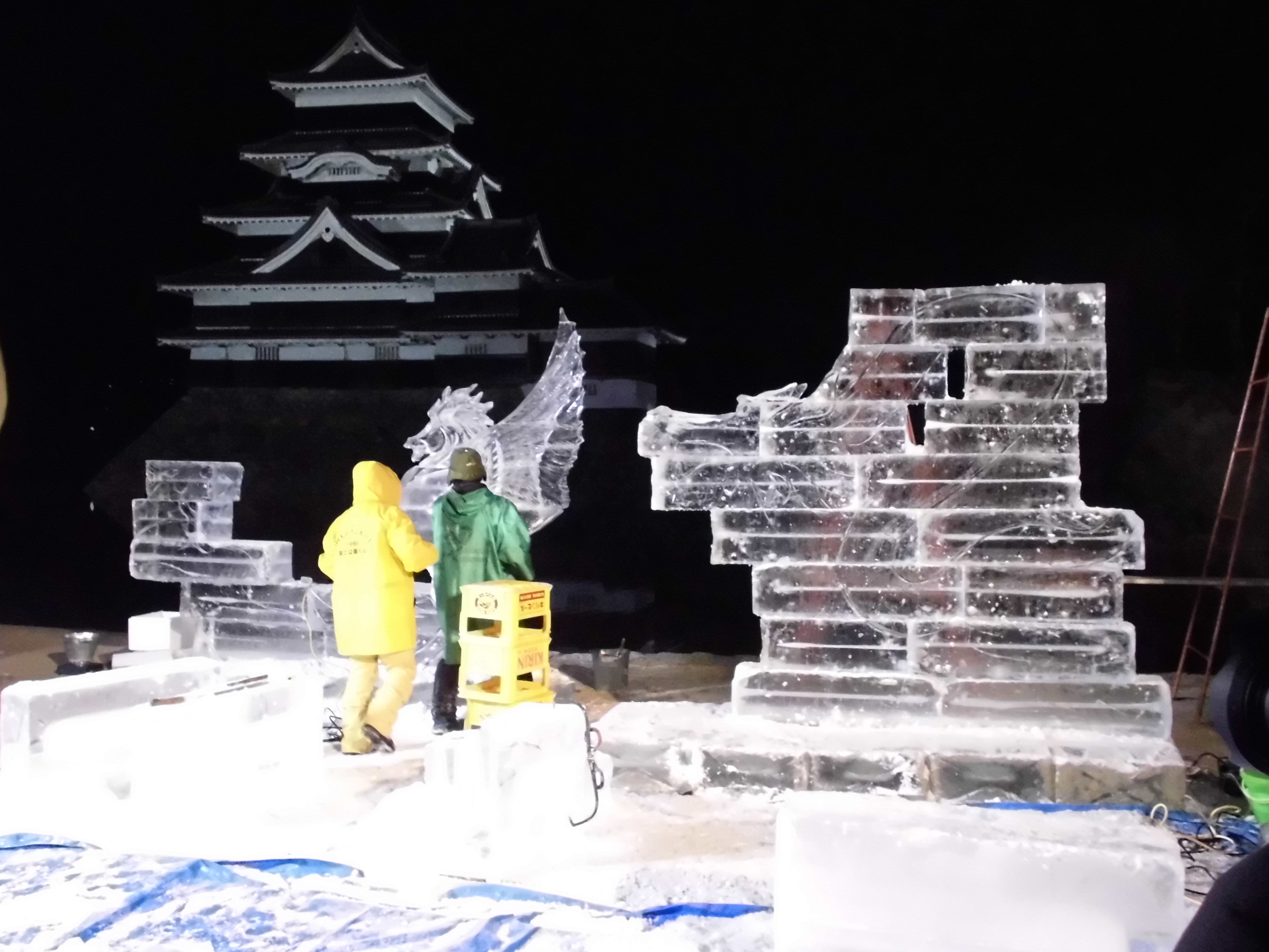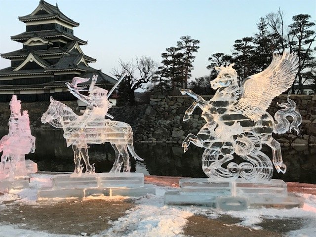 北アルプスや松本城を背景に美しく光り輝く氷の彫刻は一見の価値がありますよ♫