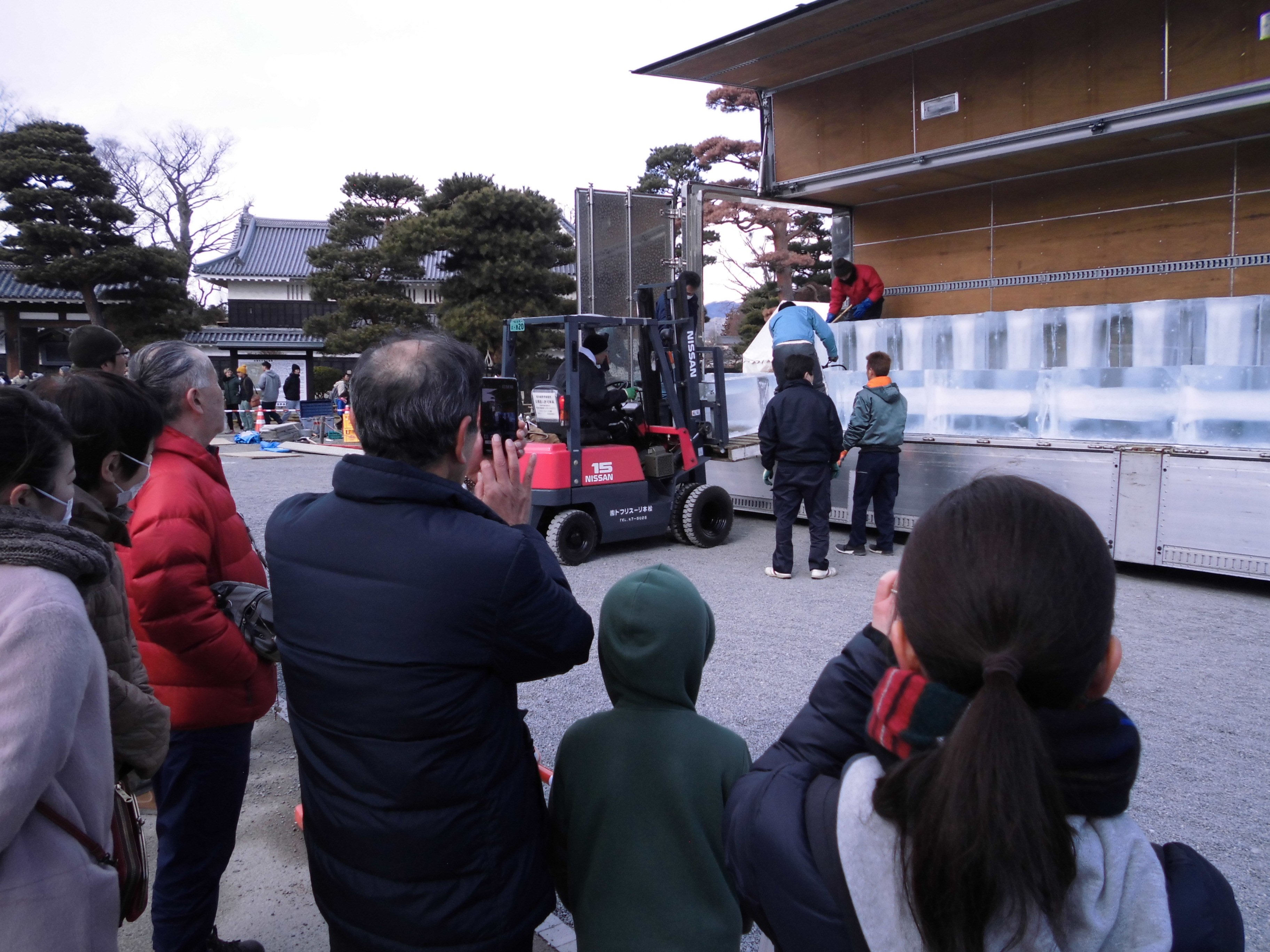 トラックのコンテナが開けられ、中から透き通った氷の山が見えると観客から歓声が上がり、写真を撮影する人が集まってきました。