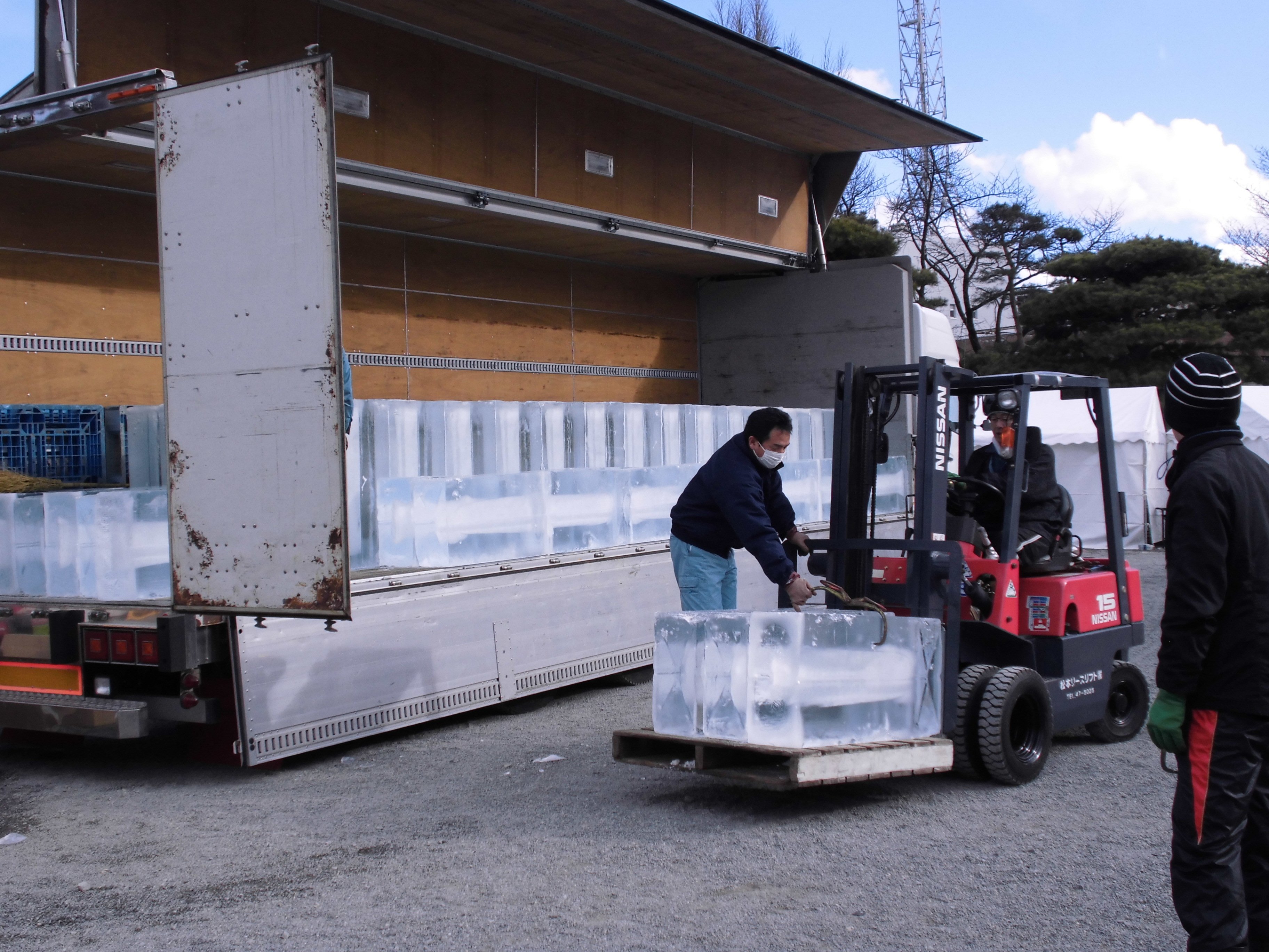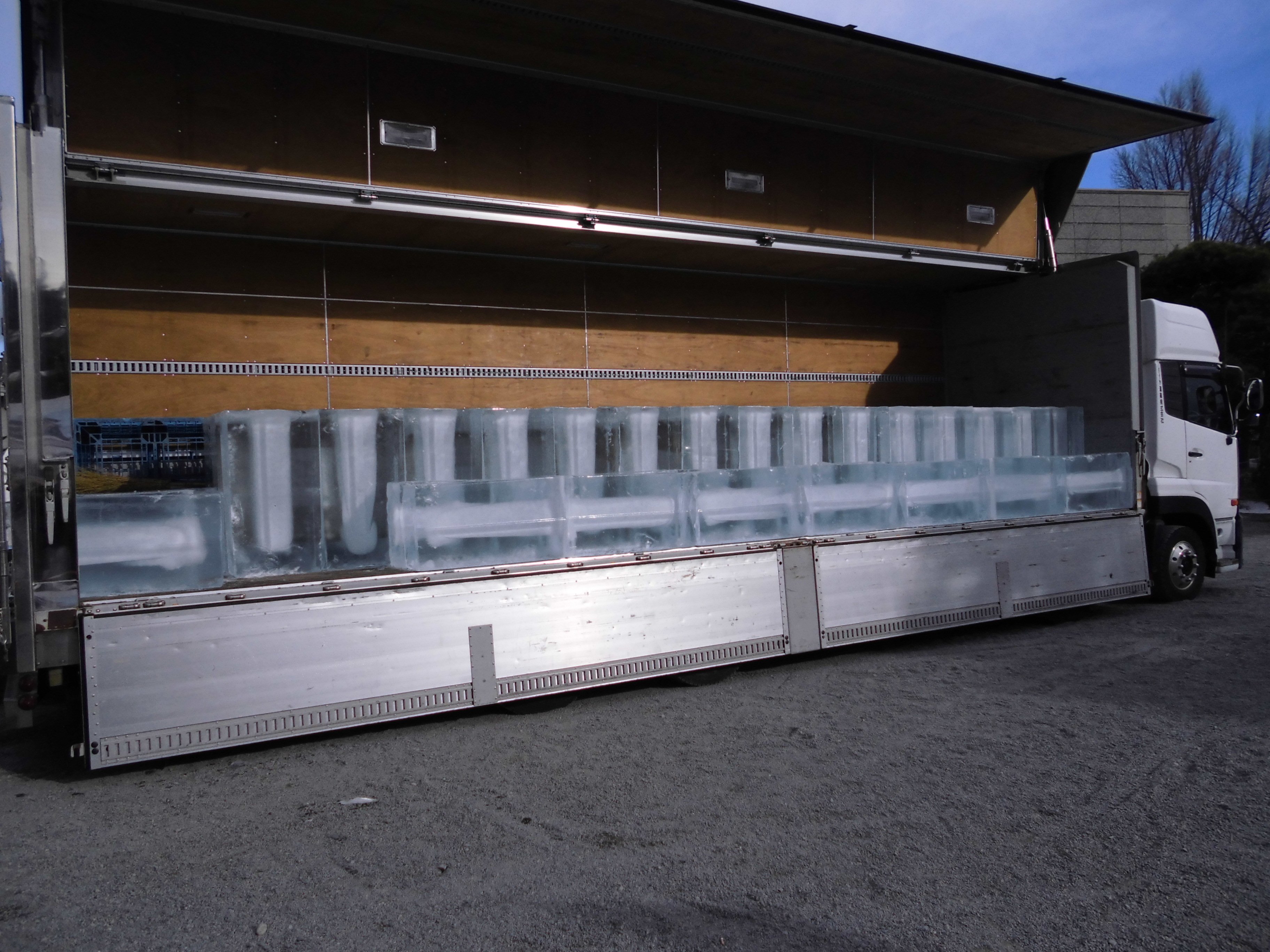 サンリンI&Fでは、氷彫の制作時間にあわせて、26日の午後から大型トラックで氷柱を搬入しました。