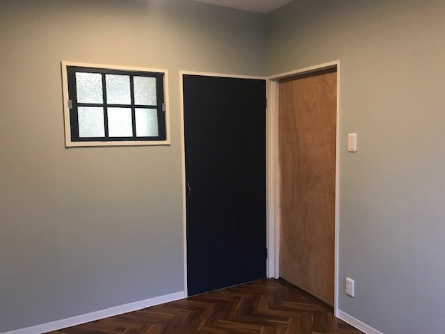 お施主様が塗装されたドアやレトロな内装窓がとてもお洒落です