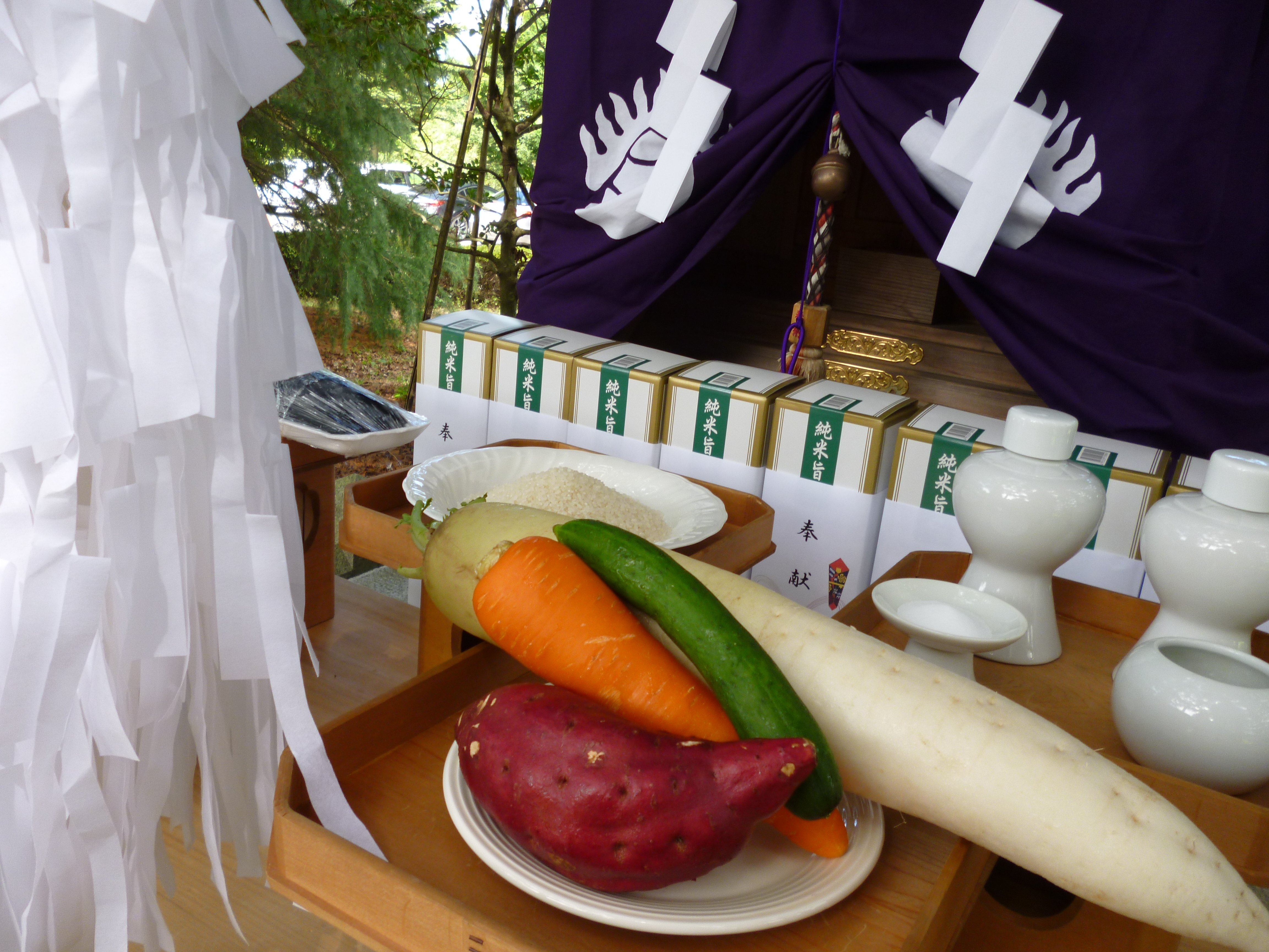 お酒や野菜・米・魚などの神饌(お供え物)を用意して、松本市四柱神社の宮坂宮司様にお越しいただきました。