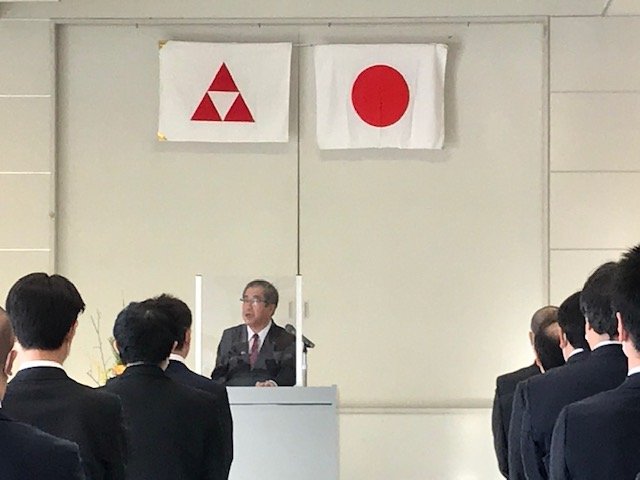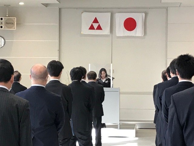 今年は新型コロナウィルスの感染防止策として、ソーシャルディスタンスをとり、略式での開催となりました。国歌を拝聴し、塩原社長から年頭の挨拶がありました。