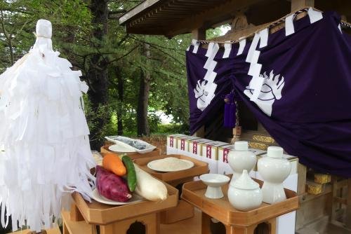 塩鱒・油揚げ・新米・野菜・お酒を神饌(お供え物)として用意しました。