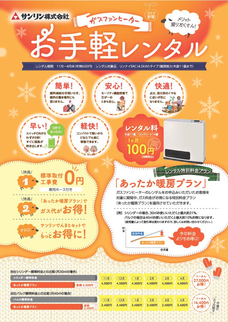 毎年11月から4月末までの6ヶ月間にガスファンヒーターのレンタルキャンペーンを実施しております。期間中は月々100円(年間最大600円)のレンタル料金でガスファンヒーターをご利用いただけます。