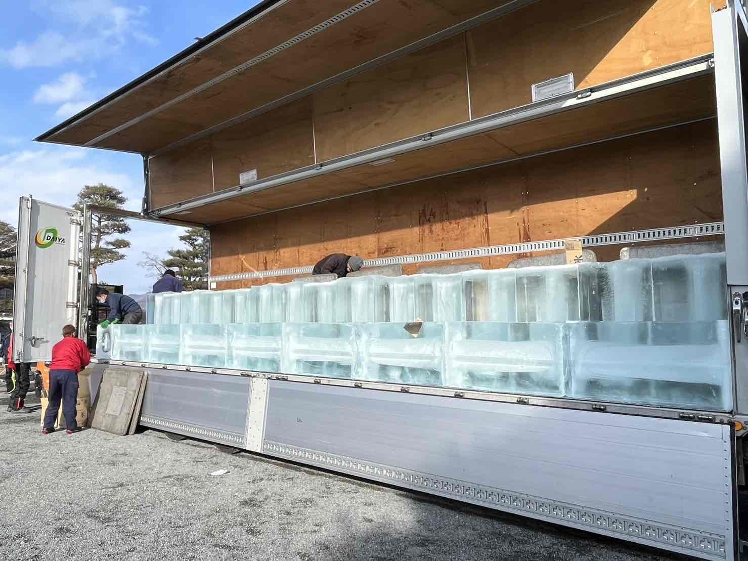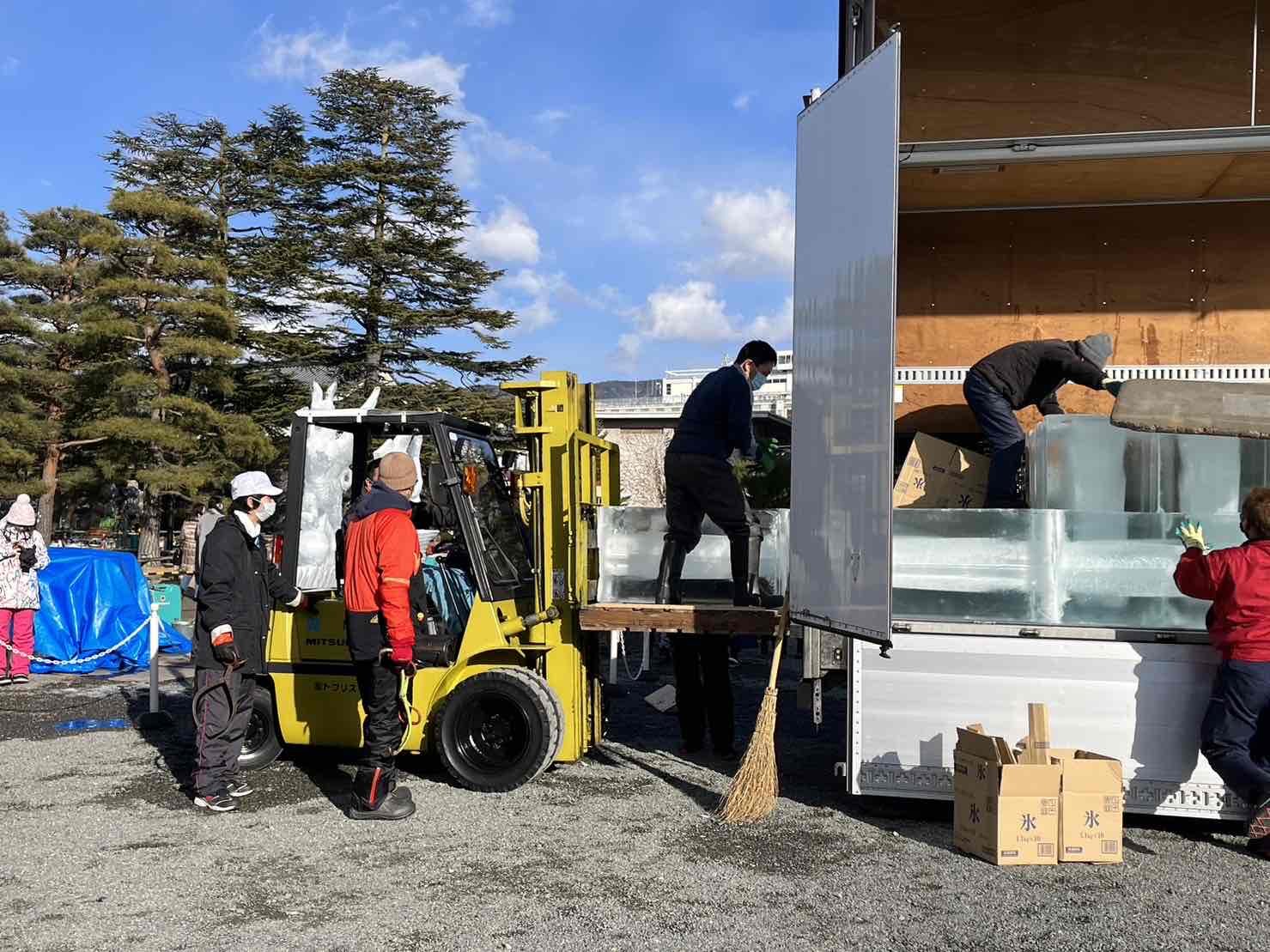 搬入された氷柱はフォークリフトに積込まれ、コンクール参加者の元に届けられます。