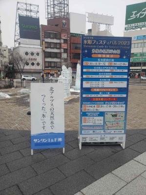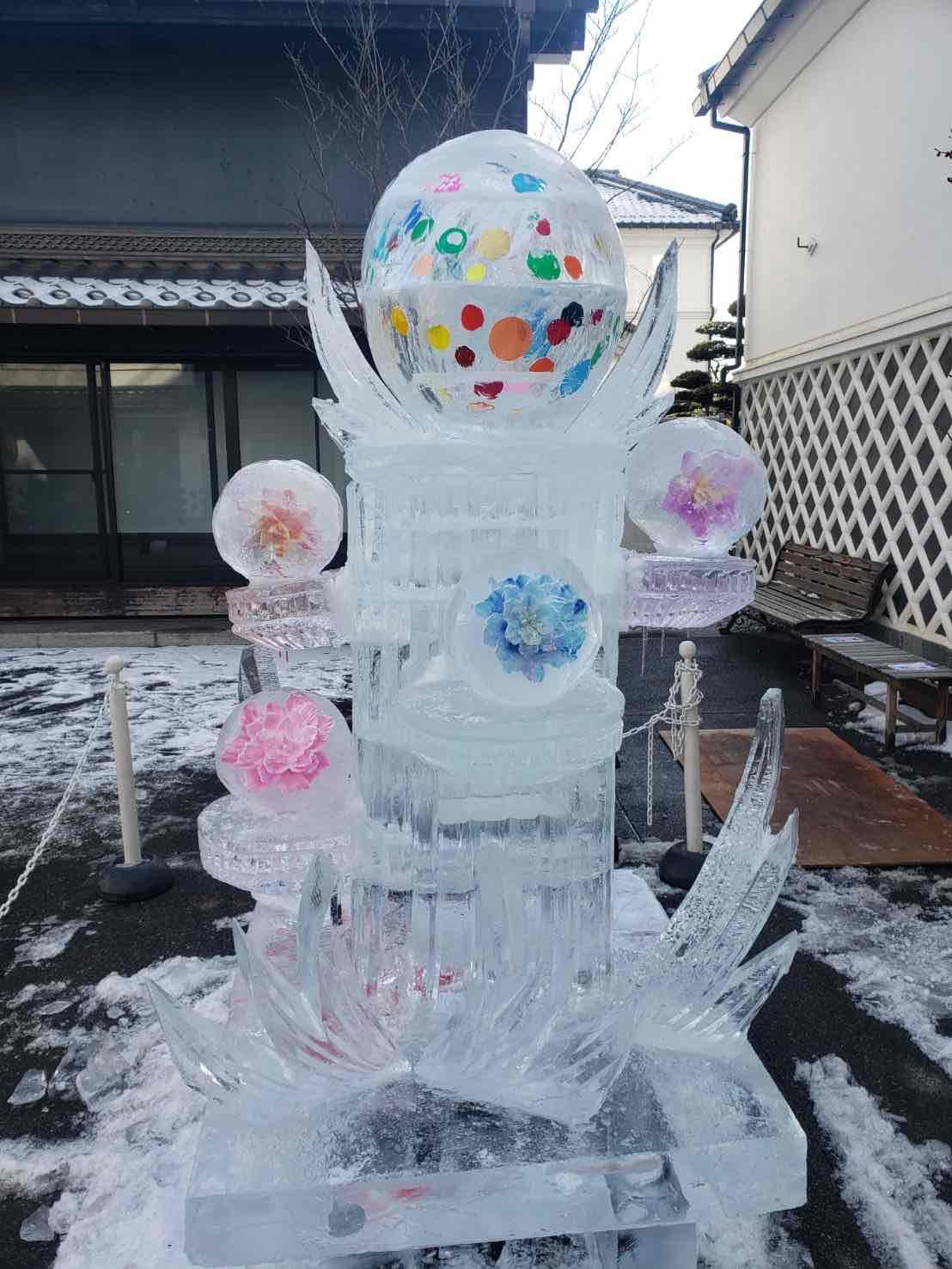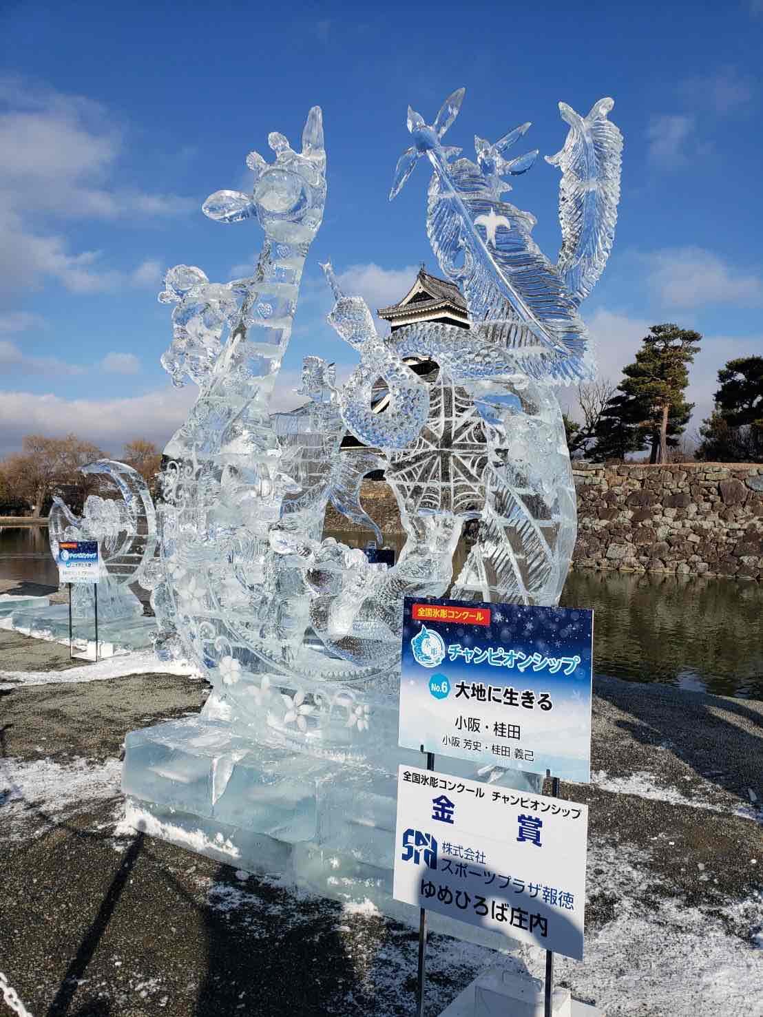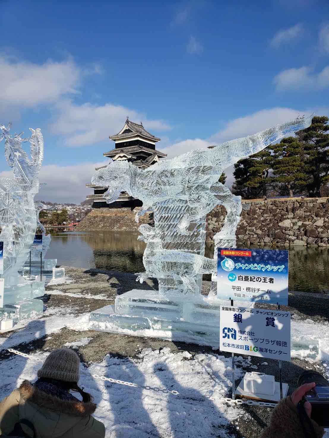 国宝松本城と冠雪のアルプスを背景にした氷の彫刻は、とても壮大かつ繊細で、