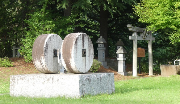 直径1.2mほどある石のローラーが2つ繋がった形をしたこのモニュメントは「フレットミル」と呼ばれ、煉炭・豆炭の原料の石炭石を粉砕して煉る(ねる)ための道具となります。