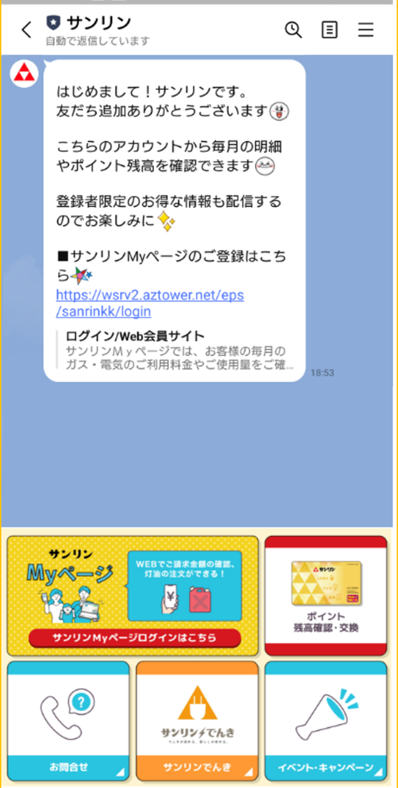 画面下のリッチメニューからはサンリンMyページのログイン画面へスムーズに移動できたり、ポイント残高が簡単に確認できます。この機会にぜひサンリンLINE公式アカウントへのお友だち登録をどうぞ★