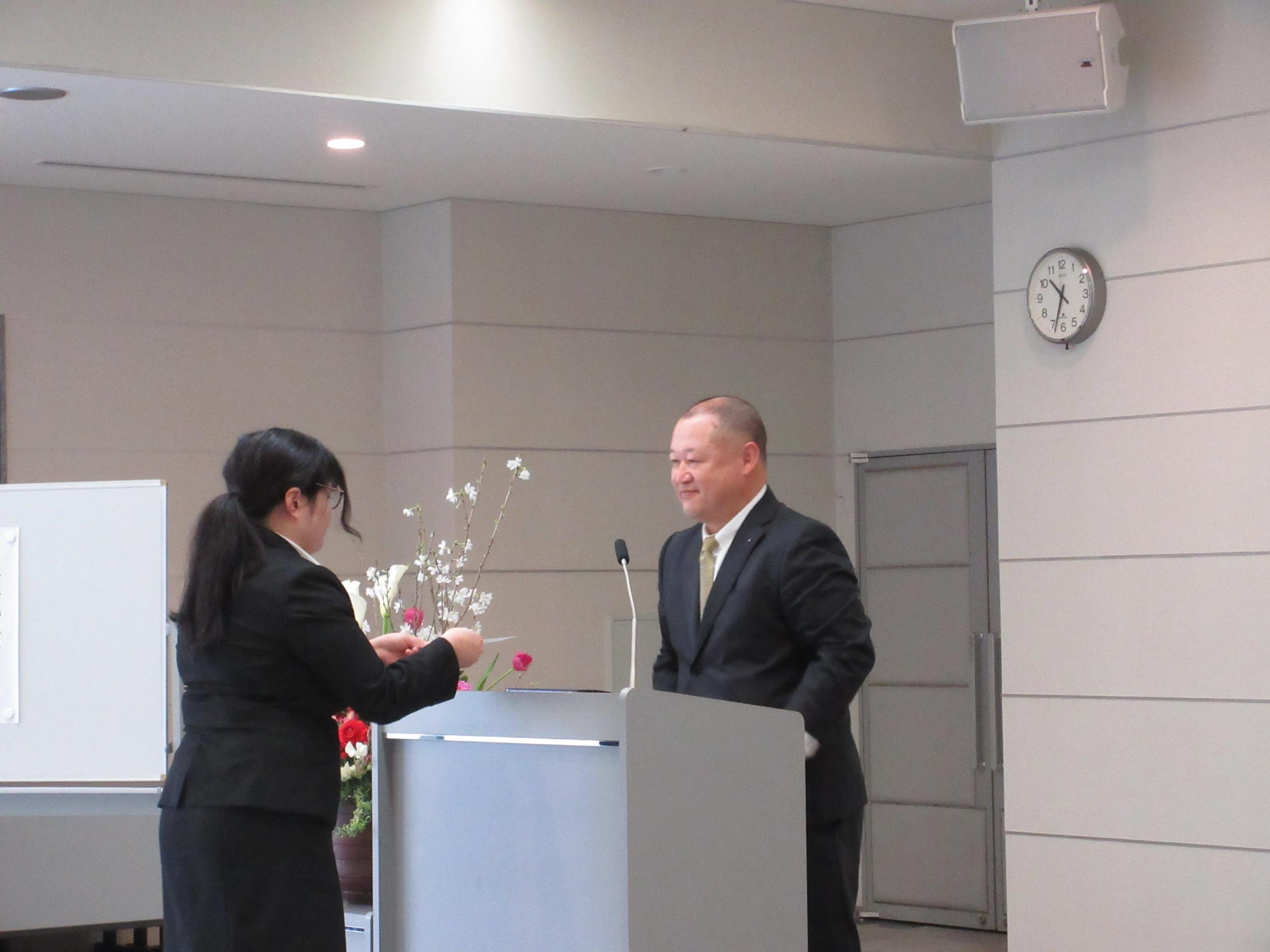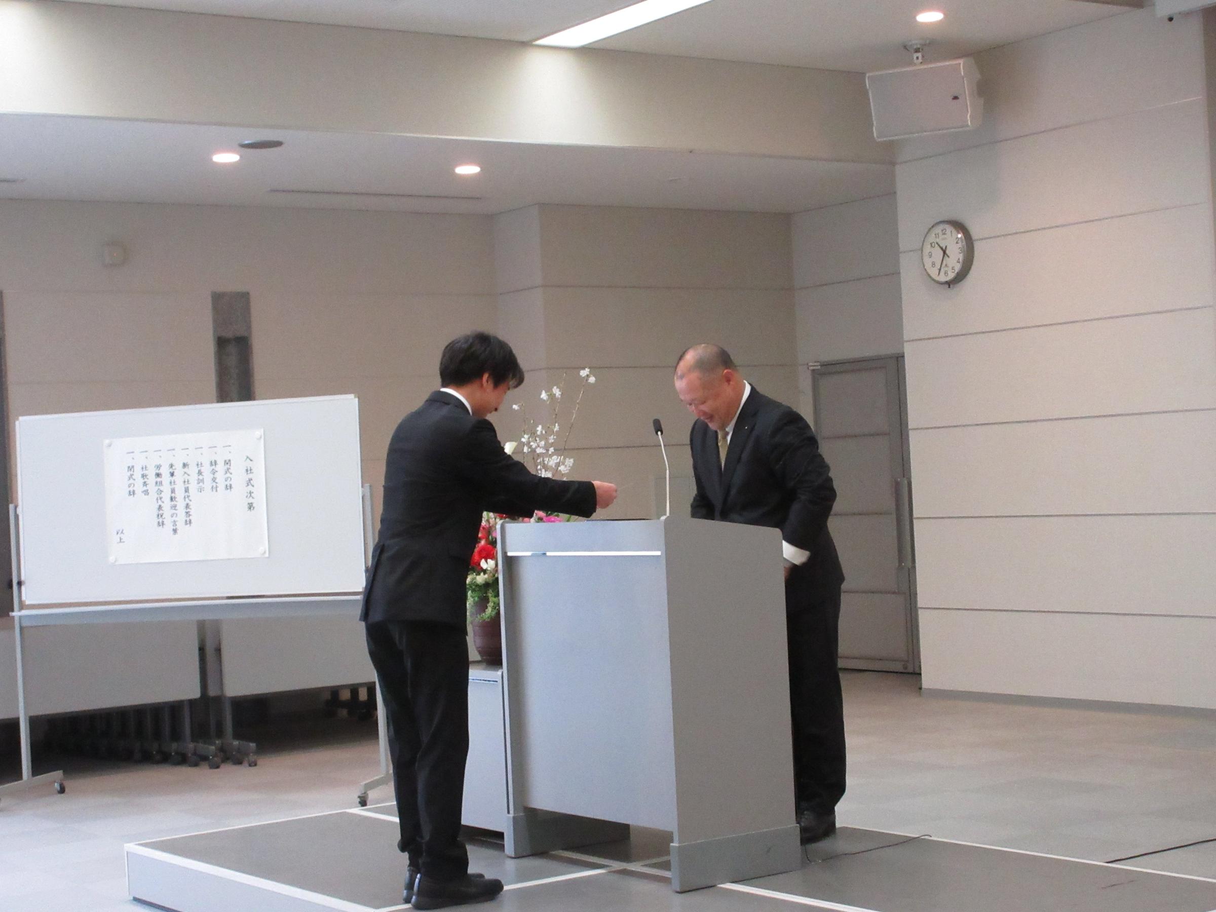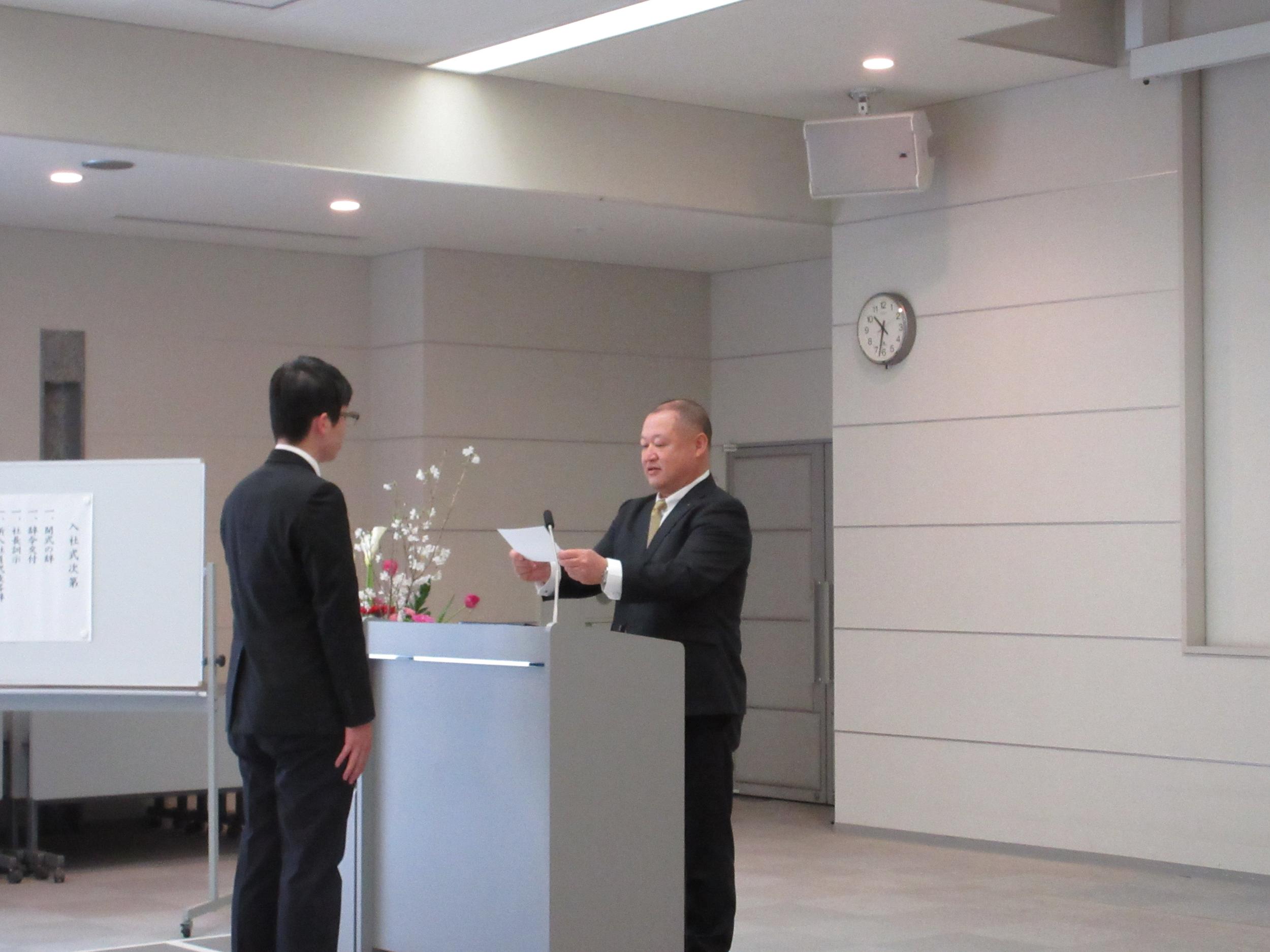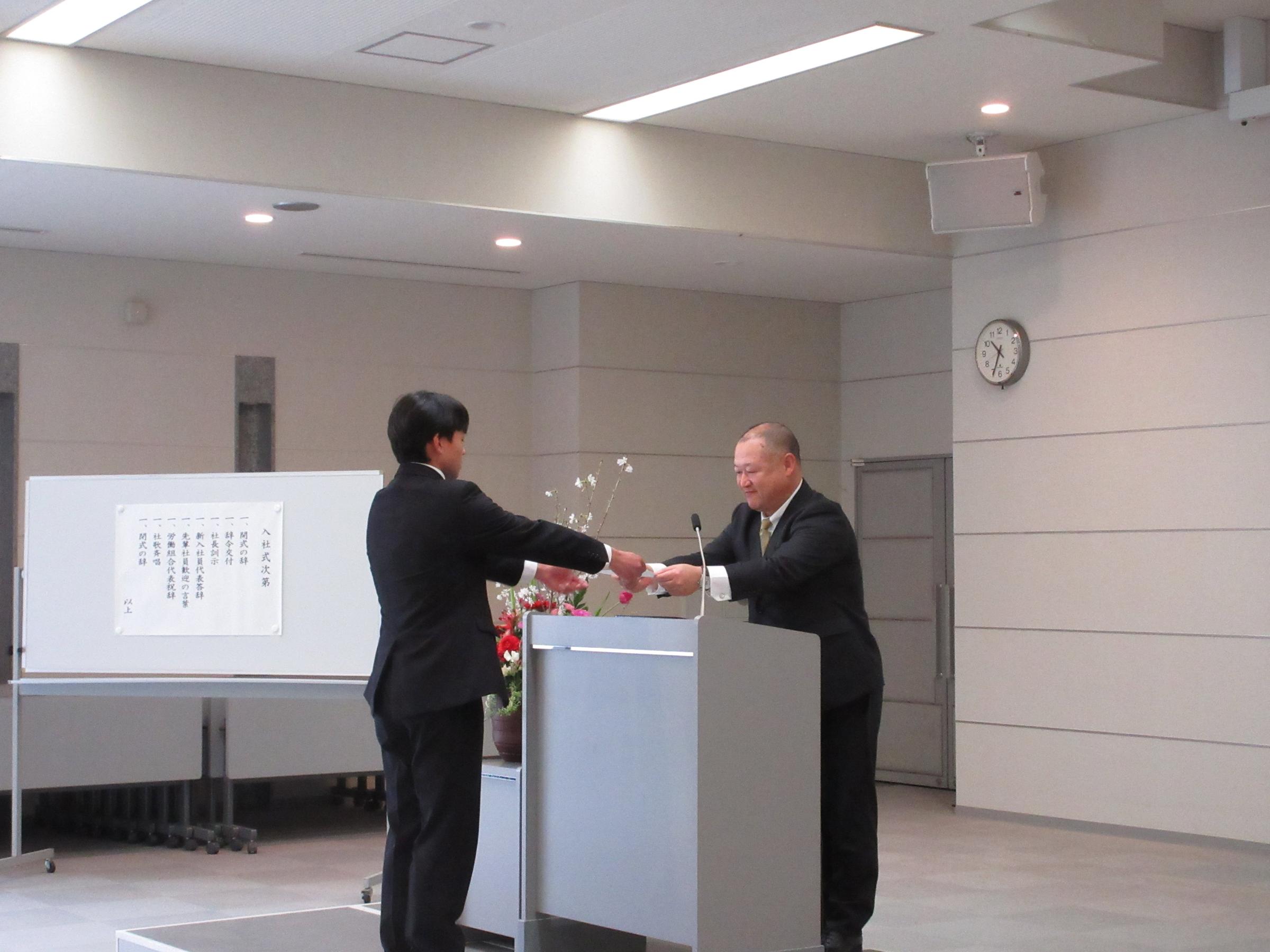 入社式ではひとりずつに百瀬社長から辞令が交付されました。
