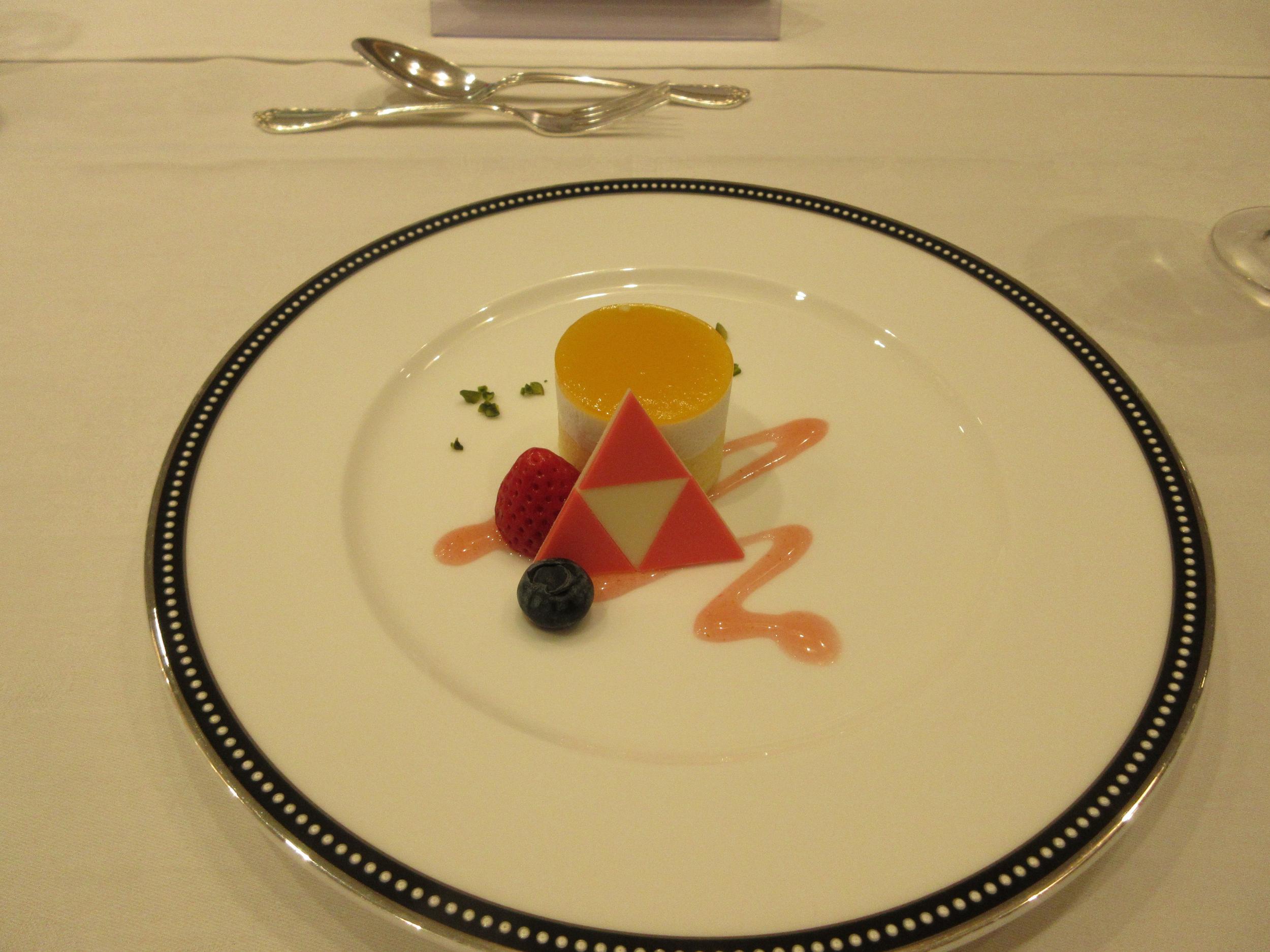 結びに写真撮影をし、入社式の後は、ホテルブエナビスタさまにて懇親会を行い、当社のロゴマークがあしらわれたデザートをいただきました。