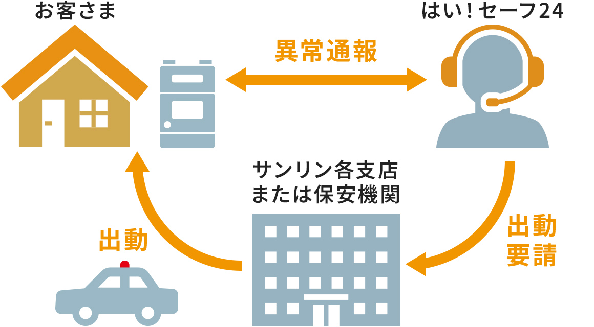 集中監視システム「はい!セーフ24」では、お客さまのお宅に設置したガスメーターからの異常情報をリアルタイムで受信、迅速に対応します。