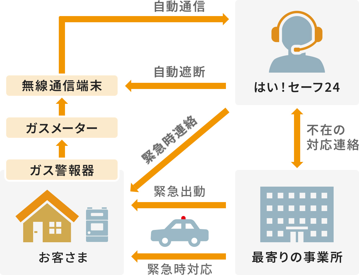 - その他、安全上必要な場合には、「はい!セーフ24」からお客さま宅のガスを遮断することができます。