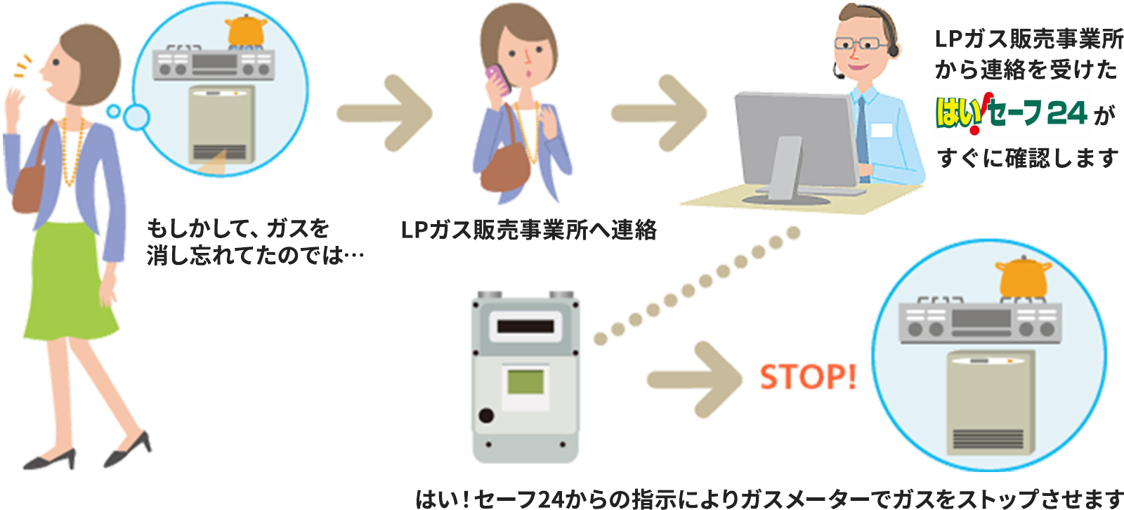 外出先で、ガスの消し忘れが気になった時など、LPガス販売事業所へお電話ください。LPガス販売事業所より連絡を受けた「はい!セーフ24」が、お客さまにかわって通信網を通じてガスメーターにアクセスし、万が一の場合は遮断します。