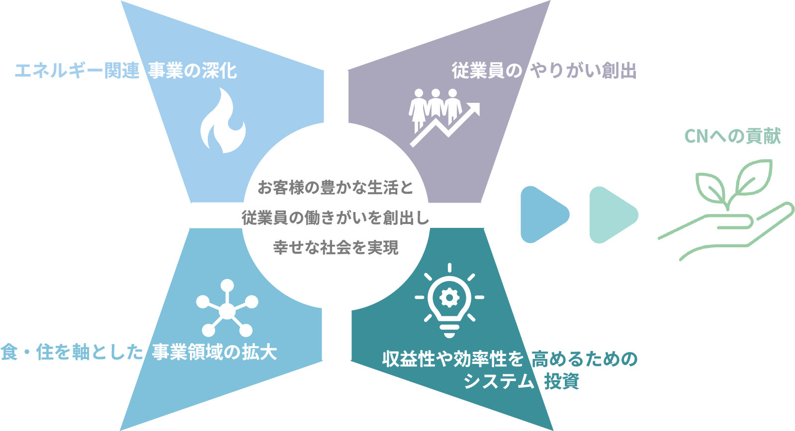 - 4つの戦略への取組みによって、当社の成長と幸せな社会の実現を両立しながら、地域の脱炭素へ貢献して行きます