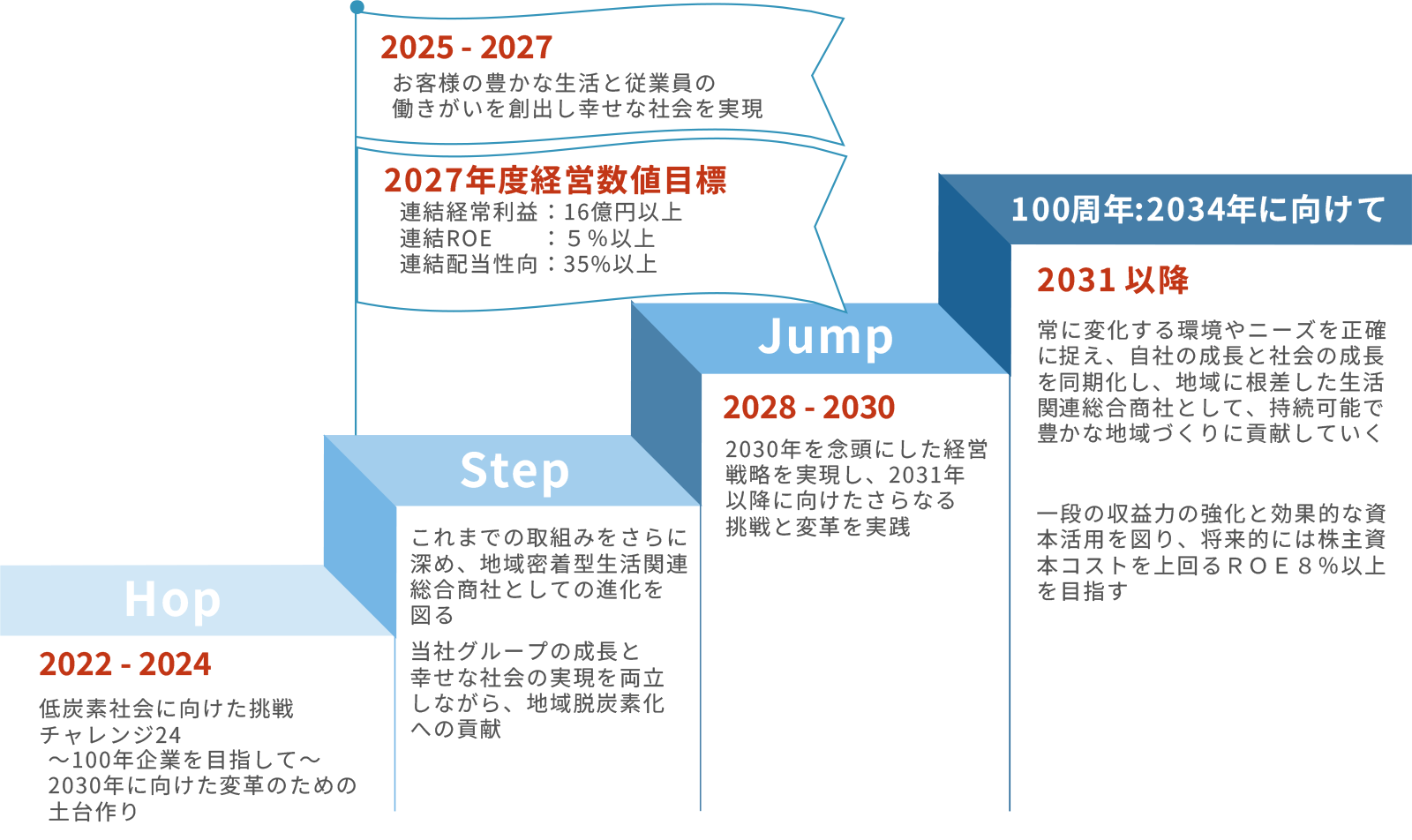中期経営計画(2025-2027)は、2030年を念頭にした経営戦略「2050年のカーボンニュートラルを見据えつつ、2030年に向けて現段階で着実に実践可能な対応、脱炭素の前段と言える低炭素への取組みを徹底して進めます。」の実現に向けた第二フェーズとして、これまでの取組みを加速して行きます