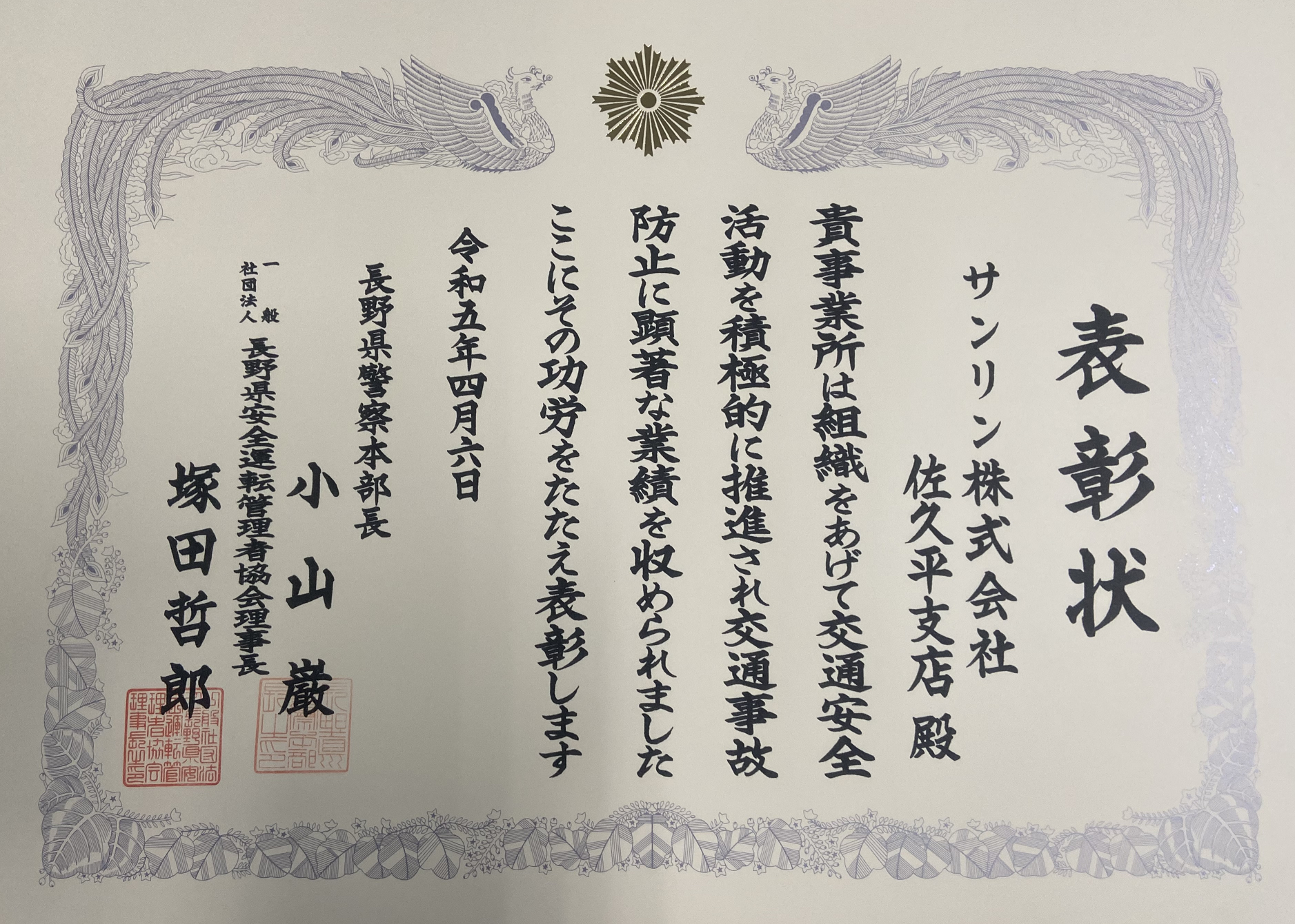 当社の佐久平支店は、5月26日に(一社)長野県安全運転管理者協会より「令和4年度 長野県安全運転管理者協会優良事業所表彰(長野県警察本部長連名表彰)」を小諸警察署にて受賞しました。