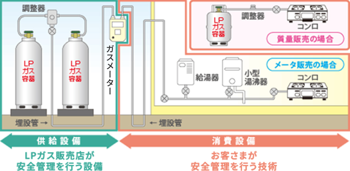 容器からガスメーターまでは供給設備と呼ばれ、この部分はLPガス販売店が責任をもって安全管理します。